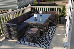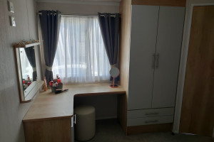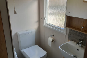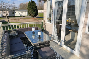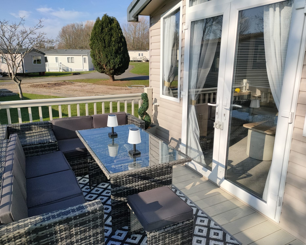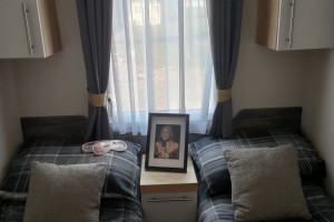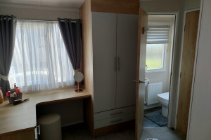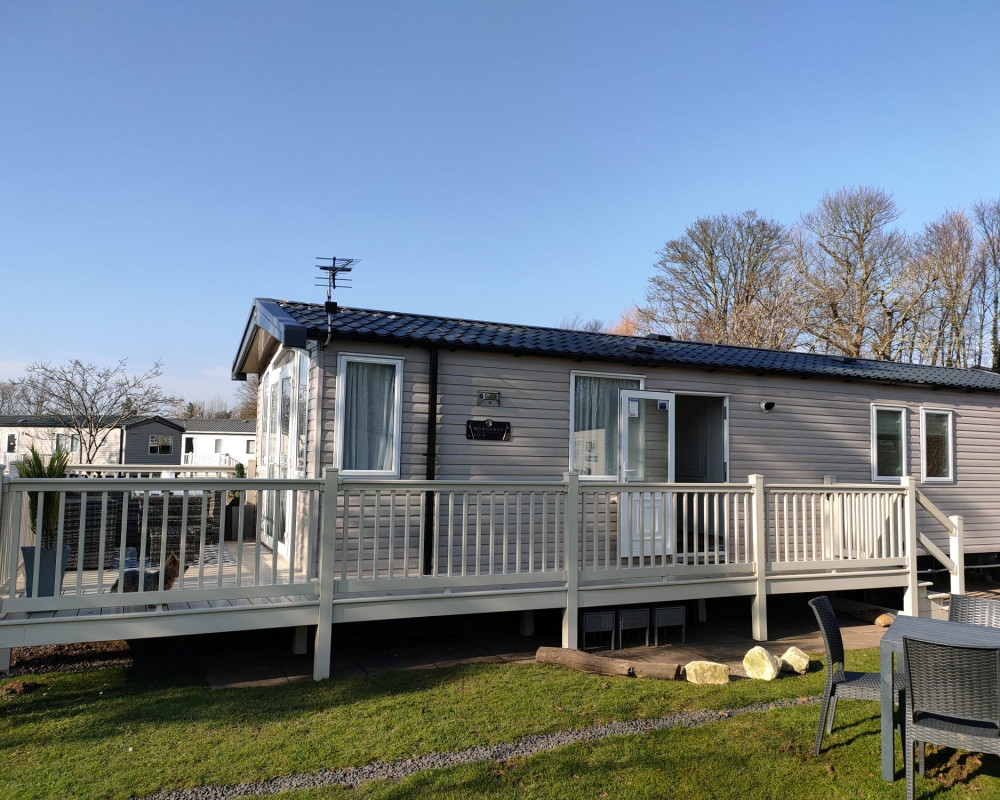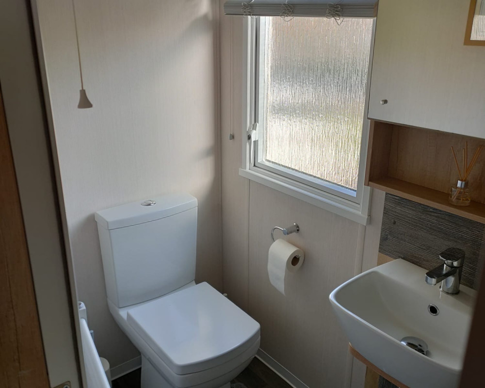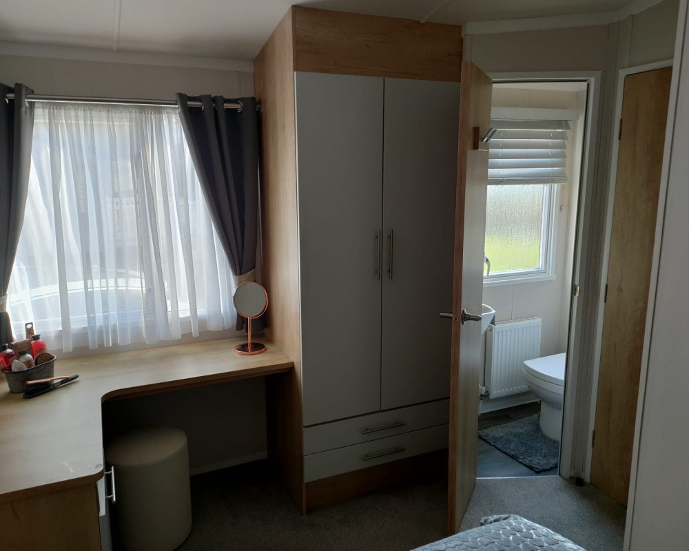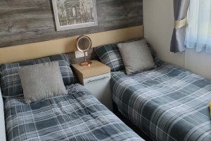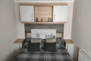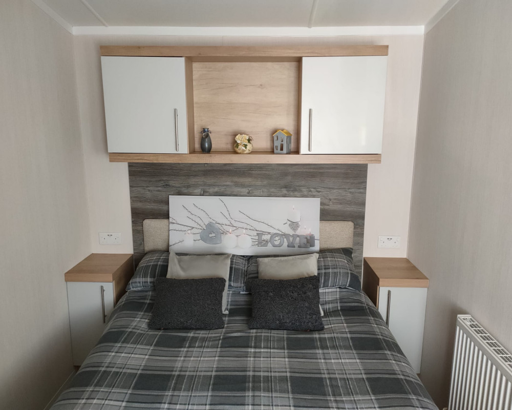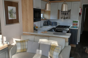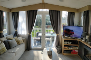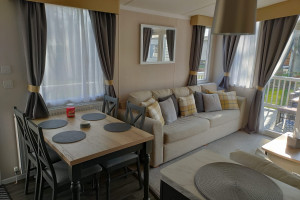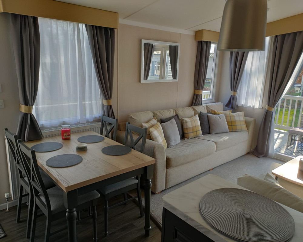 The 2021 Swift Bordeaux (40x12, 3-bedroom) is a premium, 8-berth static caravan featuring a modern, open-plan layout with driftwood-effect furniture, opulent, tropical-themed soft furnishings, and front patio doors. Key amenities include central heating, double glazing, a fully equipped kitchen (integrated fridge-freezer, microwave, and optional dishwasher), and an en-suite WC in the master bedroom.