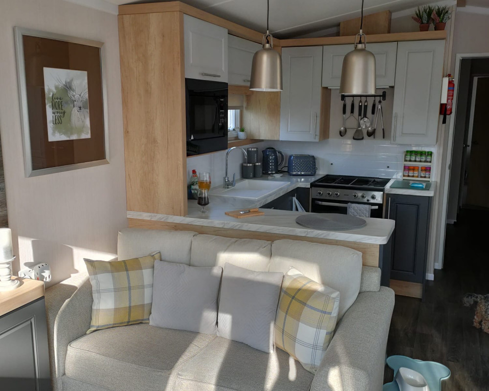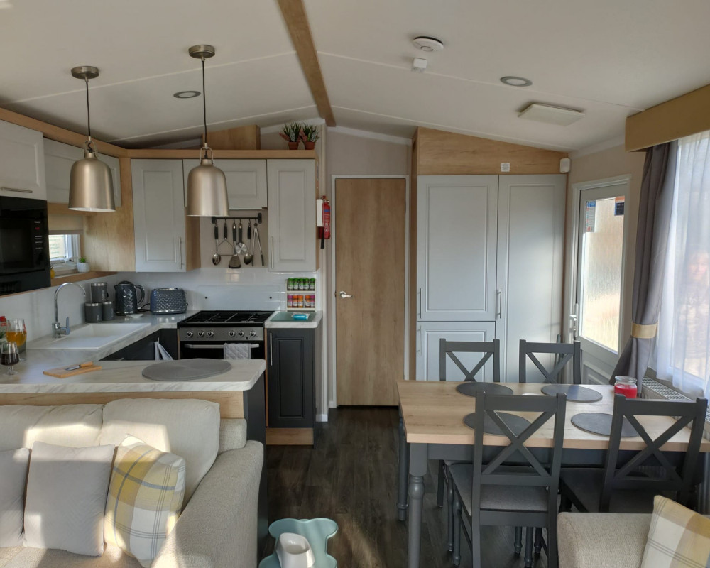 Kitchen/Dining: U-shaped kitchen with shaker-style doors, integrated cooker, microwave, and fridge-freezer. Includes a freestanding dining table and chairs.