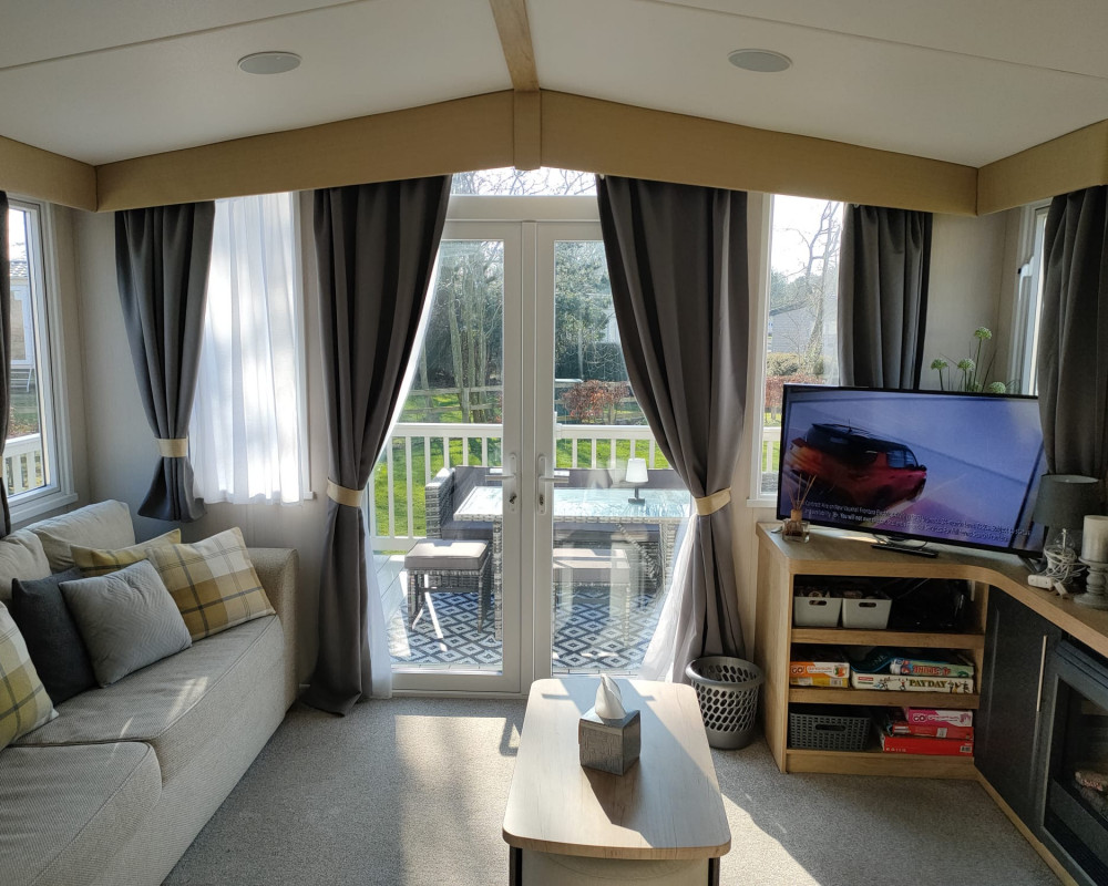 Lounge: Open-plan with front opening doors, electric fireplace, and freestanding furniture.