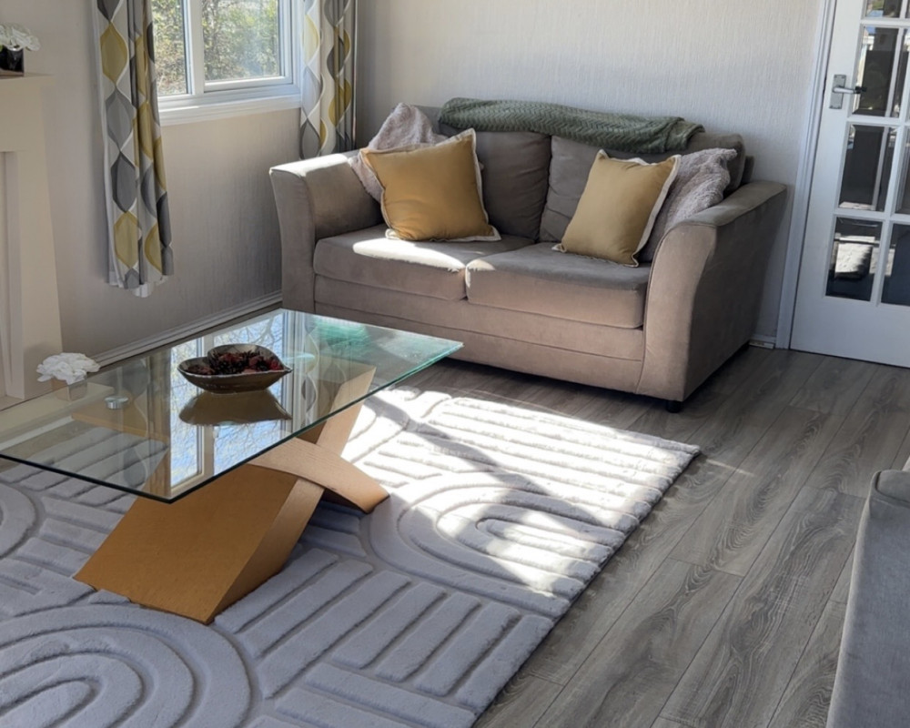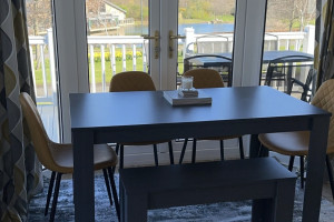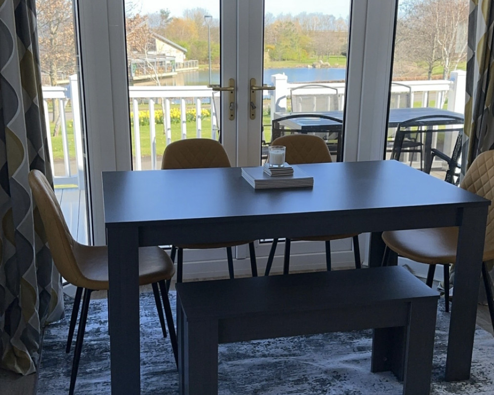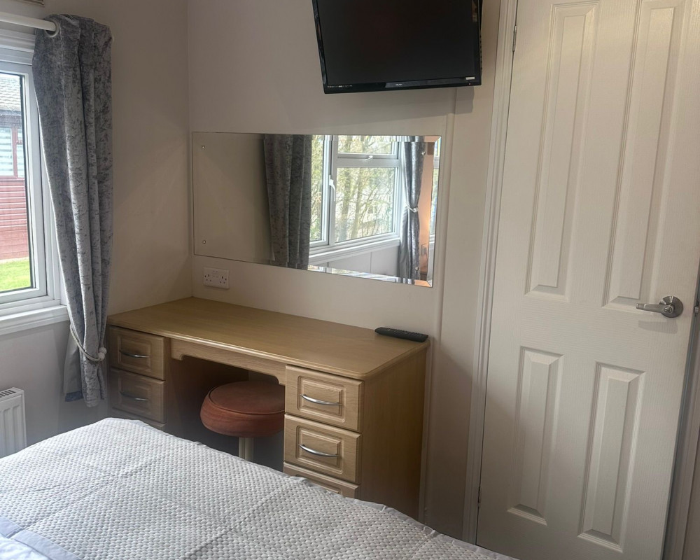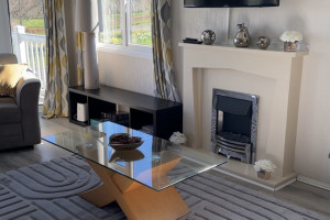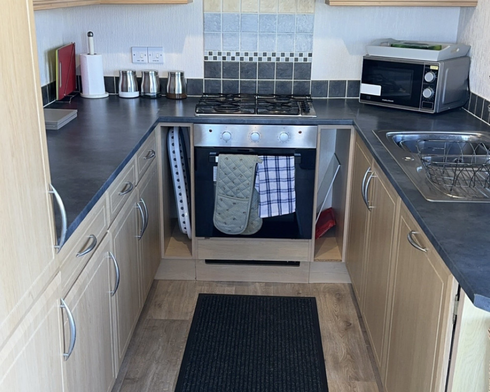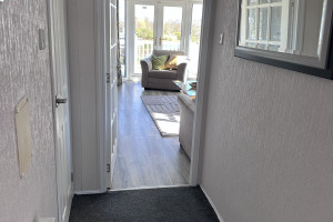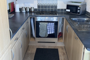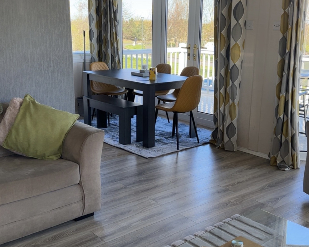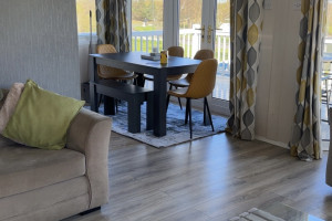 The lodge has a large open planned kitchen, lounge and dining area. The kitchen has a cooker, hob, fridge freezer, washer/dryer, kettle, mircowave, iron, radio and toaster. The kitchen is well stocked with all the pots and pans you will ever need. The dining table sits 6 people easily. The lounge has a wall mounted TV The 2 large french windows open out onto the veranda and allow lovely views over the park.